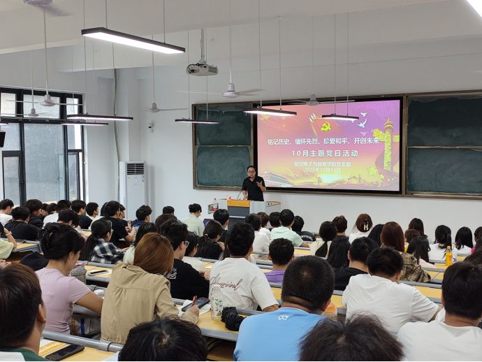 为深入推进爱国主义教育,筑牢青年学子理想信念之基,2025年10月14日下午14时,航电学院党支部与马克思主义学院教师党支部在公教楼3号楼111、112教室联合举办红色电影系列展播首场活动。本次活动以“重温光辉历程,汲取奋进力量”为主题,邀请了航电学院党员教师及航电学院300余名团员学生踊跃参与,现场座无虚席,气氛庄重而热烈。