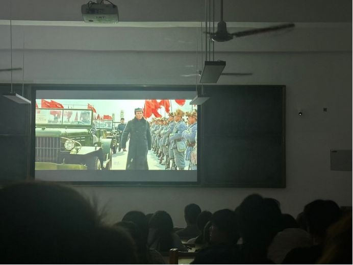 随后,全体同学集体观看了史诗巨作《建国大业》。影片以宏大的历史视野,生动再现了从抗日战争结束到新中国成立前夕那一系列波澜壮阔的重大事件。同学们凝神屏息,沉浸于那段风雨如磐的岁月之中,为革命先辈们坚定的信仰、无畏的牺牲和深沉的爱国情怀所深深震撼。当影片中国旗冉冉升起、国歌奏响的时刻,许多同学的眼眶湿润了,民族自豪感与历史使命感在心中激荡。