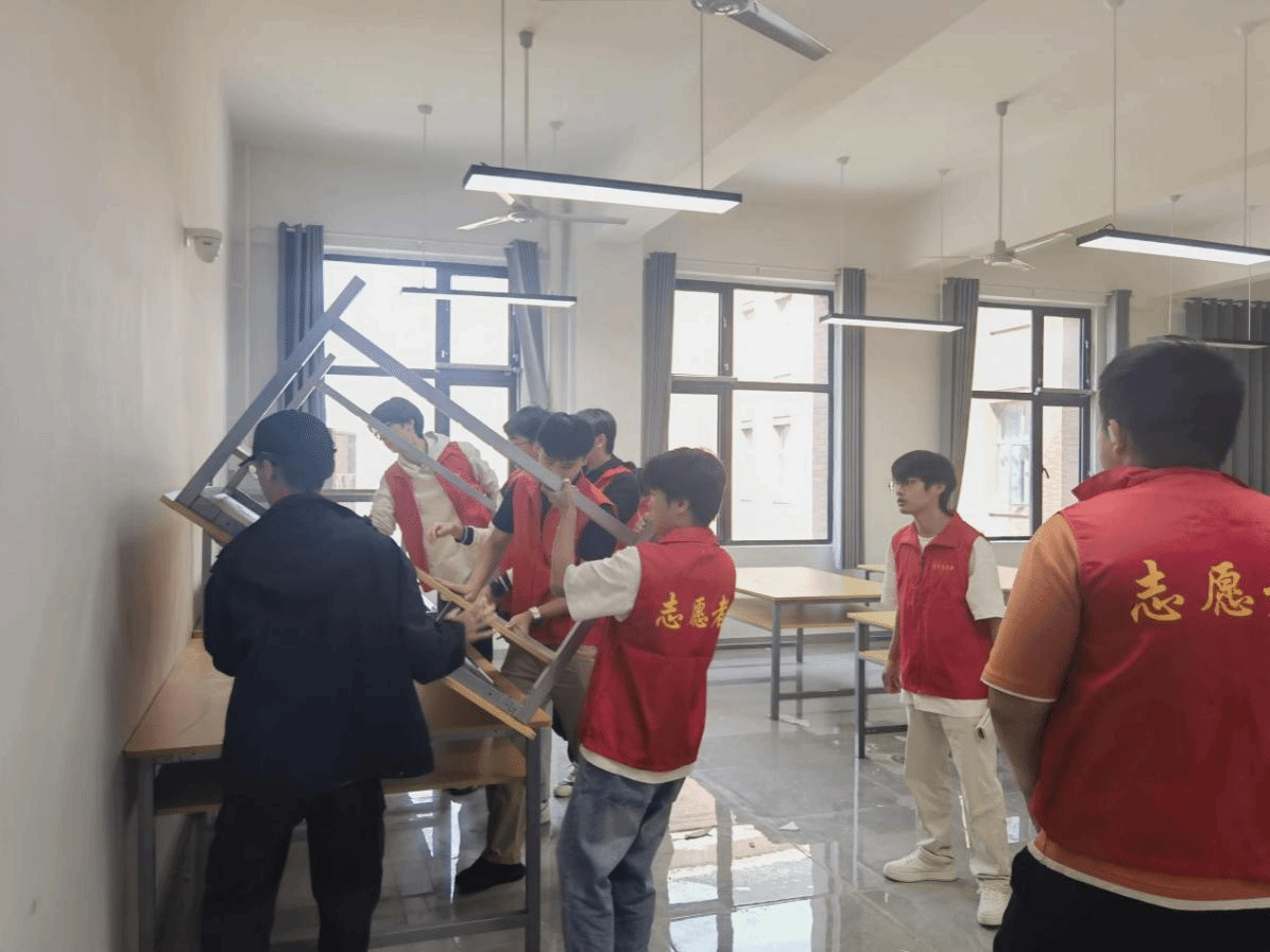 活动现场,党员同志们身穿红色志愿服,迅速投入到教室桌椅整理的工作中。大家分工明确、配合默契:有的俯身清理墙角缝隙的灰尘,有的仔细搬运堆放的教具,党员们逐一攻坚清理。双手协作中,杂乱的桌椅、角落都恢复整洁,原本凌乱的教室在大家的努力下焕然一新。