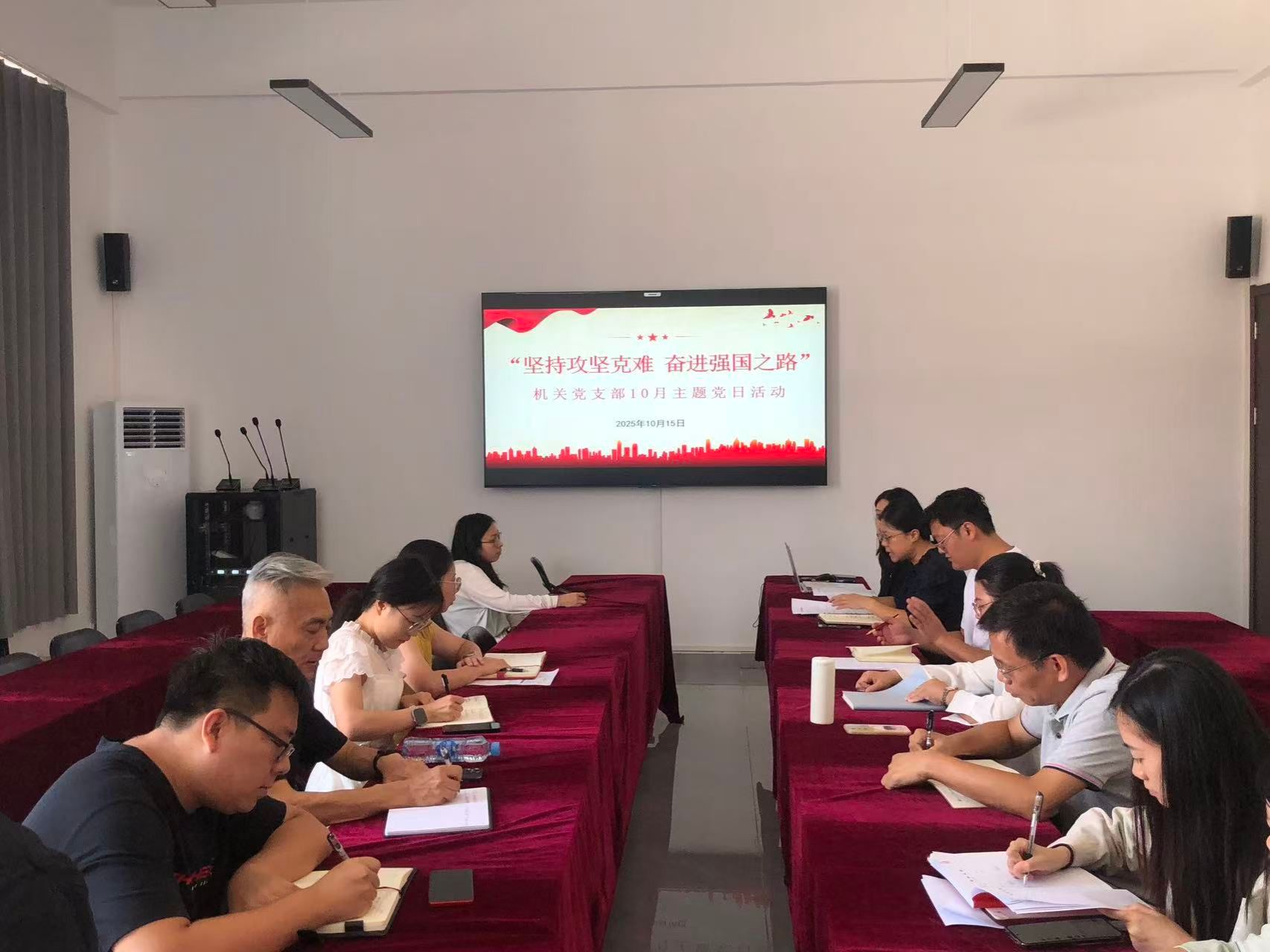 2025年10月15日下午上午,机关党支部在学生事务中心3楼会议室开展“坚持攻坚克难 奋进强国之路”十月主题党日活动,会议由支部书记金亚丽主持。