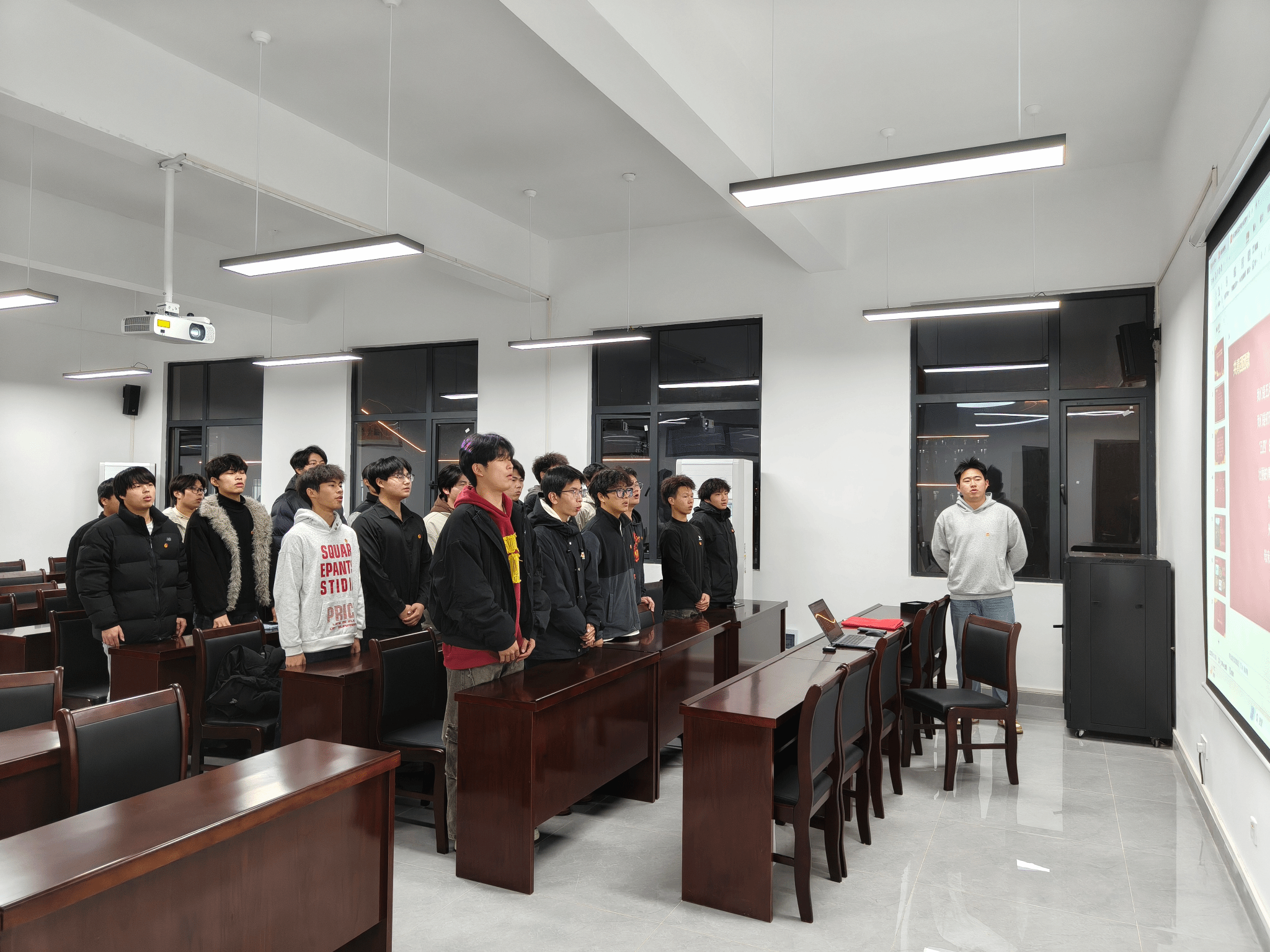 无人装备学院分团委组织委员欧阳杰勋带领全体成员共唱共产主义青年团团歌《光荣啊,中国共青团》,全体团员身着整齐服装,昂首挺胸、精神抖擞,齐声高唱《光荣啊,中国共青团》。歌声里,有青年对共青团的无限崇敬,有对青春岁月的热忱期盼,更有对家国情怀的深情抒发,每一个音符都凝聚着团员们的青春朝气。