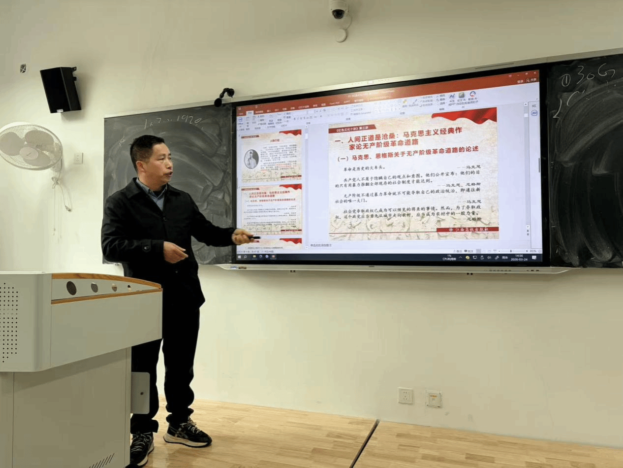 本次备课以"传承红色基因,筑牢理想信念"为核心。主讲人何老师率先分享授课思路,他说:课程当中有很多标题都是取自于毛泽东诗词或革命者的相关诗词,第三讲,为有牺牲多壮志,敢教日月换新天,是取自于毛泽东诗词《七律·到韶山》,正是因为无数革命先烈前仆后继,流血牺牲,才铺就了一条改天换地的革命成功之路。第一部分内容,人间正道是沧桑,马克思主义经典作家论无产阶级革命道路。人间正道是沧桑同样取于毛泽东诗词《七律·中国人民解放军占领南京》,人间正道,以深邃的哲理强调了社会发展的必然规律,富有非常厚重的历史纵深感和中国共产党人的使命感。第二部分,中国革命道路的艰辛探索,前面的创业艰难百战多是取决于陈毅的梅岭三章,更多的是表达中国共产党人在革命道路上艰辛探索的历程中,革命者那种视死如归,不怕牺牲的牺牲精神以及将革命进行到底的革命的彻底性。在授课的过程当中更多的以我们红色历史的感人故事给同学们讲述,如在革命过程当中,中国共产党的第一面红旗是怎么打出来的。同时以红色的故事,引导我们的同学感悟其中的人生哲理,比如我们当代大学生在学习的过程何尝不是一种自我的革命,怎么样将自我的革命进行下去?必须像我们革命意志坚定的革命者一样,有巨大的克服一切困难的勇气,要富有斗争精神,要与那个懒惰的自己作斗争,与那个懒散的自己作斗争,与那个上课不认真听老师讲课,喜欢打瞌睡的自己作斗争,那么我们的人生道路就像中国革命的前景一样光明。