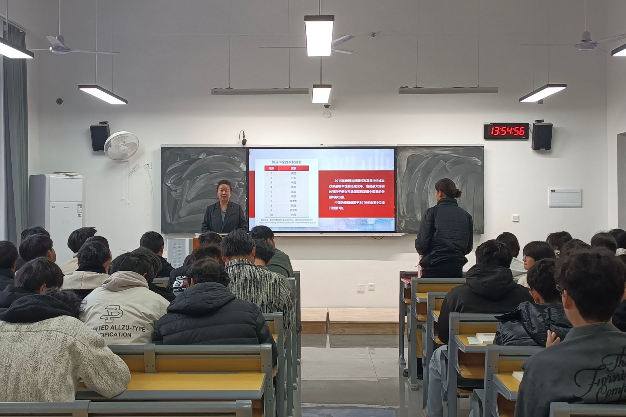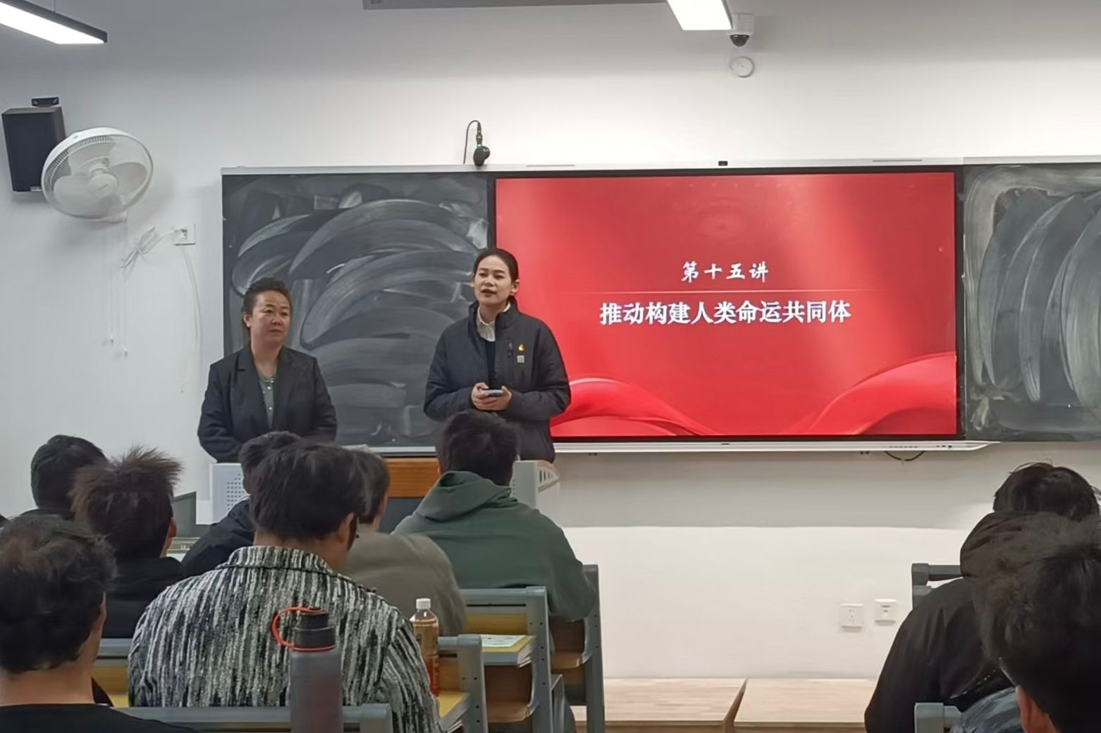 钱冰洁老师则从课程教学与专业视角出发,配合潘莹璐书记的讲授,通过案例分析、问题研讨等方式,将构建人类命运共同体的宏大主题与同学们的学习生活、职业发展紧密关联。她引导同学们结合专业特点思考,如何在未来的学习和工作中,以技术创新助力国际交流合作,以专业能力服务全球民生福祉,让抽象的理论理念转化为可感知、可践行的行动指南。双师配合默契、各有侧重,既有高屋建瓴的理论引领,又有贴合专业的实践指导,让课堂内容既有深度又有温度,有效提升了思政课的吸引力与感染力。