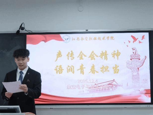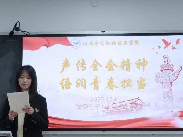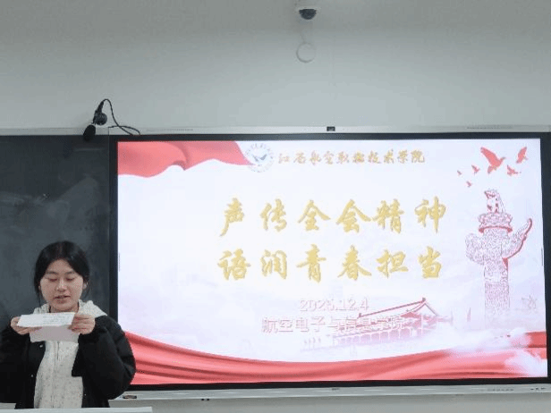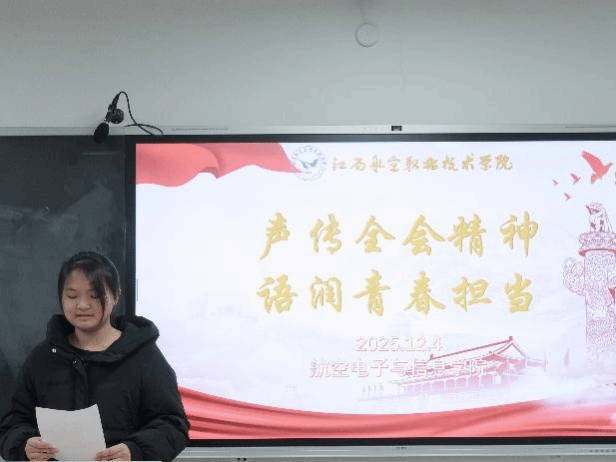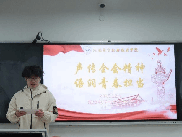 为深入学习贯彻党的全会精神,推动理论学习与青年思想引领深度融合,凝聚青年群体思想公共识,确保全会精神在校园落地生根。2025年12月4日17:00,航空电子与信息学院在抚州校区二号公教楼104教室成功举办“声传全会精神,语润青春担当“主题朗诵比赛。本次比赛由周佳艺同学担任主持人。
