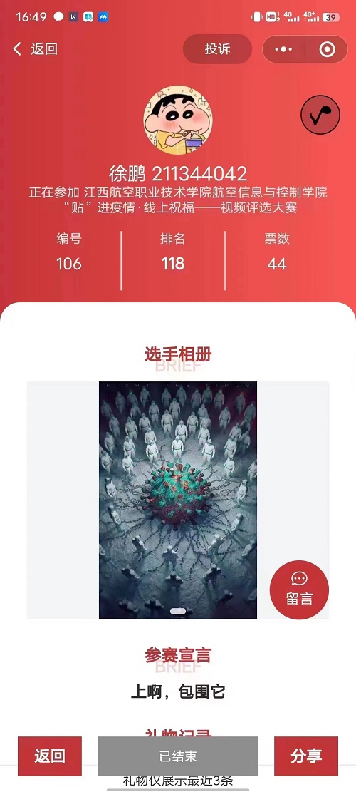 本次活动通过公众号推送扫描海报二维码或点击微信内活动链接,并按照步骤进行报名,报名成功后进入选手页面,参赛选手在提交作品后可直接转发好友或朋友圈为自己拉票。投票时间维持七天,每个微信号每天仅限一次投票权力。此次活动在暑假期间开展,学生们有重复的时间制作自己的参赛作品,作品内容丰富多彩,都表达了学生们对于战胜疫情的信心。