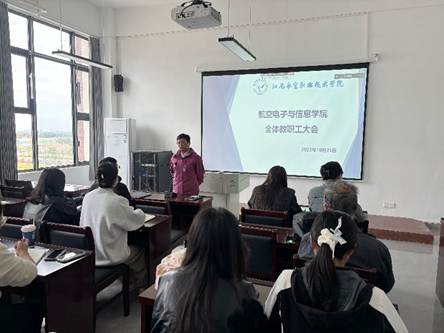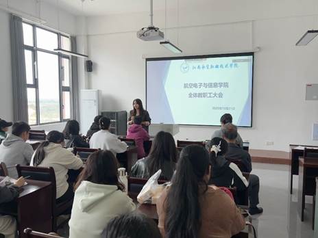 2025年10月21日下午14:00,航空电子与信息学院在学院楼401会议室召开全院教职工大会。会议采用线上线下相结合的方式,由学院党支部副书记彭雪主持。院长李利、副院长李振宇及全体教职工参加了本次会议。