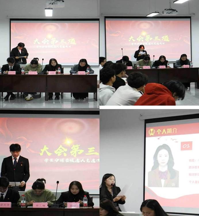 在第三项议程中,新一届分团委委员候选人胡墨雯、张晓琳、孙宇辉、刘旋依次上台进行自我介绍与竞选陈述,充分展现了航空电子与信息学院学子昂扬的精神风貌与扎实的工作能力。