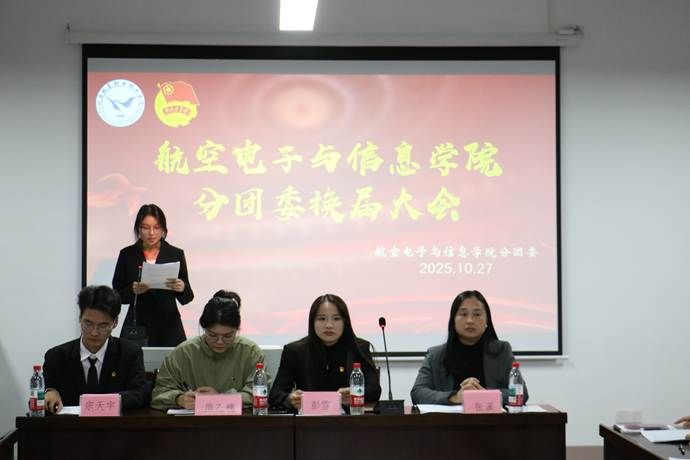 为进一步加强学院分团委组织建设,充分发挥其引领青年、服务青年的核心作用,航空电子与信息学院分团委换届选举大会于2025年10月27日晚19:00在学院楼401会议室隆重召开。学院党支部副书记彭雪、党支部组织员熊乙穗、分团委书记张溪、分团委副书记宗天宇以及全体团支书共同出席本次大会。