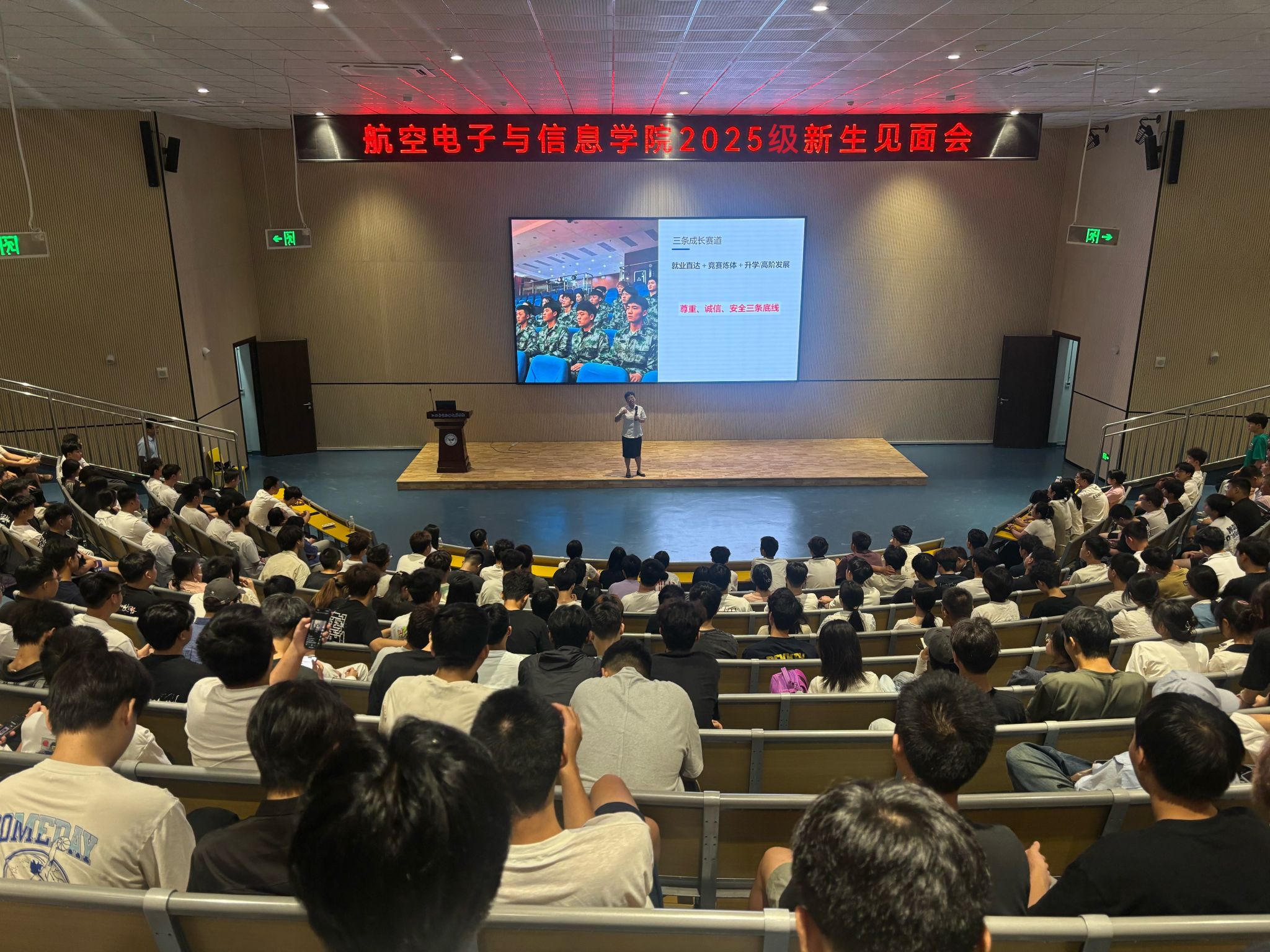 2025年9月9日9:30,航空电子与信息学院在学术报告厅举行了2025级新生见面会。会议由学院党支部副书记彭雪主持,院长李利、副院长李振宇及全体辅导员行政人员出席会议。