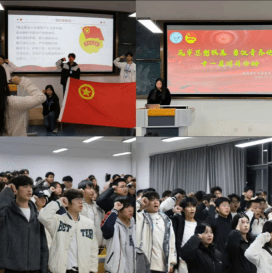 紧接着,在张俊萍同学的带领下,全体团员面向团旗,庄严重温入团誓词,铿锵誓言回荡在会场,彰显出团员们对身份的珍视与对使命的承诺。随后,分团委副书记胡墨雯同学进行领学,她深入细致地讲解了学习资料,将理论与实践紧密结合,为团员们“筑牢思想根基”提供了丰厚的理论滋养,也为“勇担青春使命”指明了清晰的实践方向。