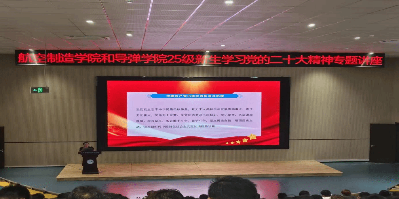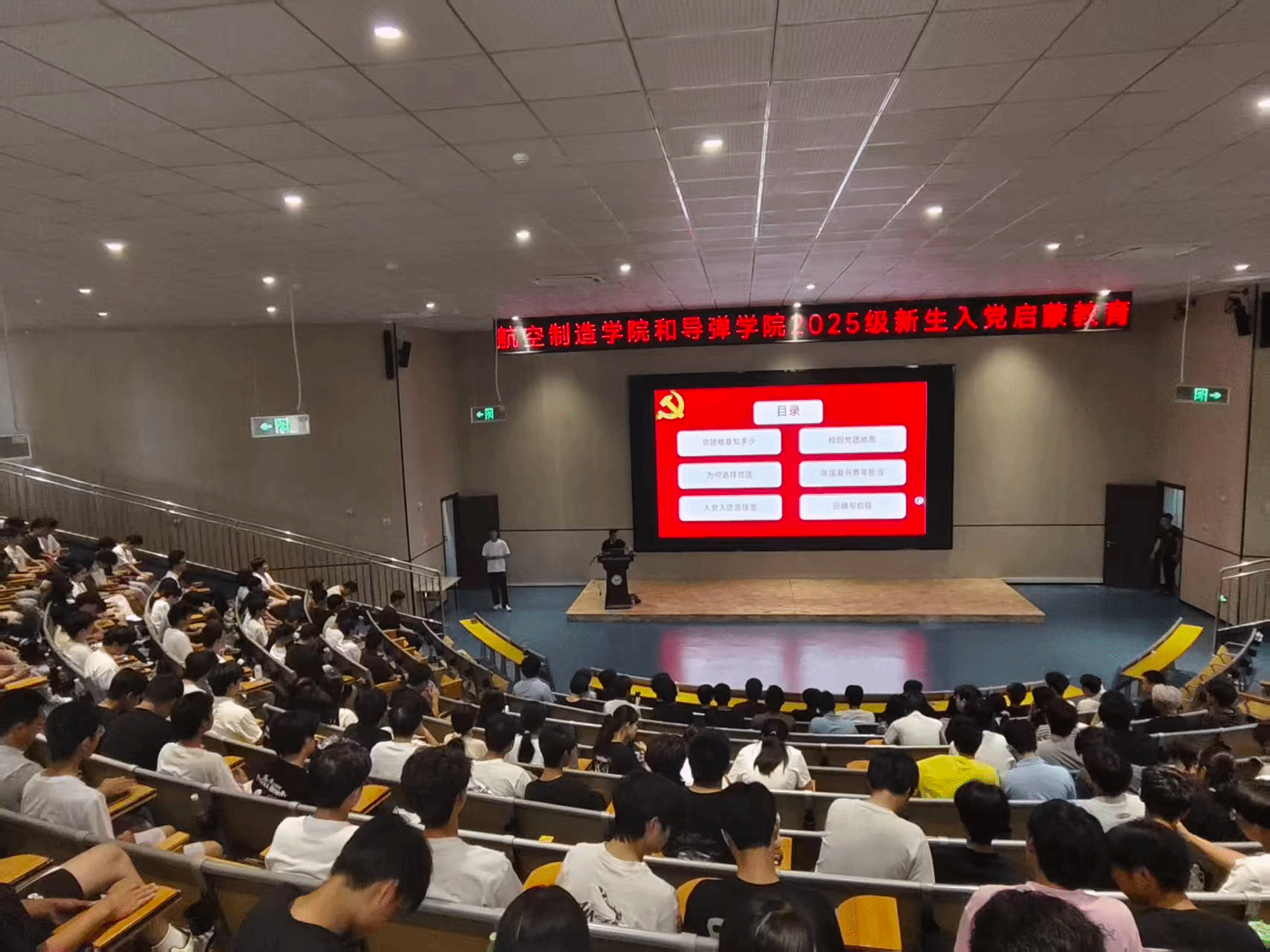 为深入学习贯彻党的二十大精神,切实加强新时代青年思想政治引领,帮助新生“扣好入党第一粒扣子”,进一步坚定理想信念、厚植家国情怀,2025年9月27日9:00至15:00,航制和导弹党支部在3号公教楼报告厅隆重举行新生入党启蒙教育活动,活动由许翀睿老师、彭诗玥老师联合主持,两院师生党员及2025级全体新生共计1500余人参加,现场座无虚席、秩序井然,洋溢着浓厚的政治理论学习氛围。