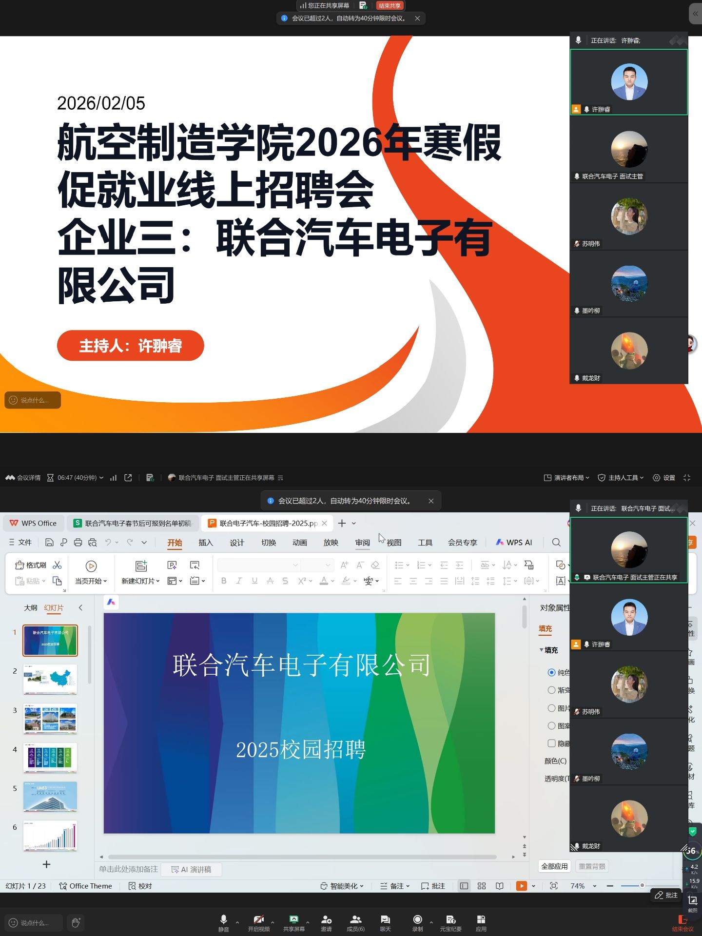 2026年2月5日,航空制造学院“寒假促就业”系列线上招聘会迎来第三场活动,汽车电子领域龙头企业——联合汽车电子有限公司受邀登场,为学院学子带来电子研发、生产工艺、质量管控等核心技术岗位,进一步夯实了学院多元化就业服务的成果。