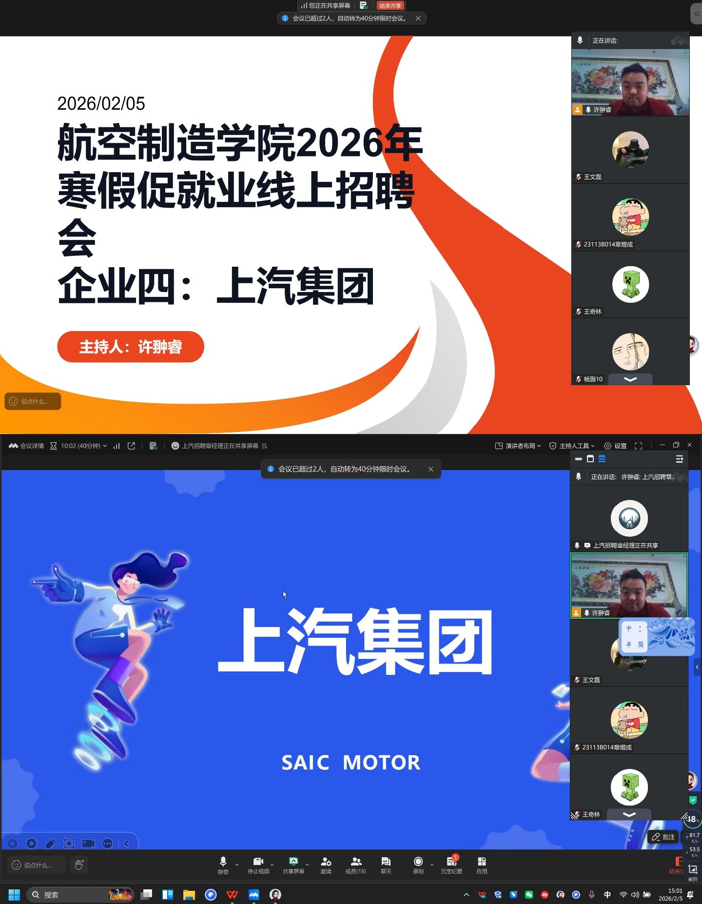 2026年2月5日,航空制造学院“寒假促就业”系列线上招聘会迎来第四场重磅活动,国内汽车产业龙头企业——上汽集团(SAIC MOTOR)受邀登场,为学院学子带来整车研发、智能制造、工艺工程等核心岗位,进一步拓宽了毕业生在高端制造领域的就业通道。