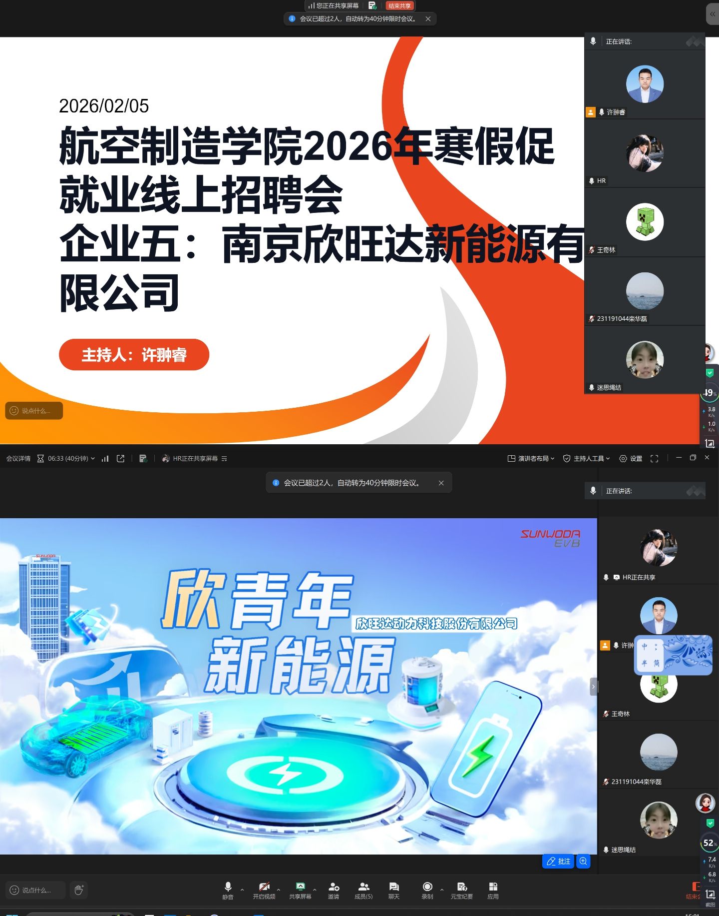 2026年2月5日,航空制造学院“寒假促就业”系列线上招聘会迎来收官专场,国内新能源电池领域头部企业——南京欣旺达新能源有限公司受邀亮相,为学院学子带来电池研发、工艺工程、智能制造等核心技术岗位,为本次系列招聘活动画上圆满句号。