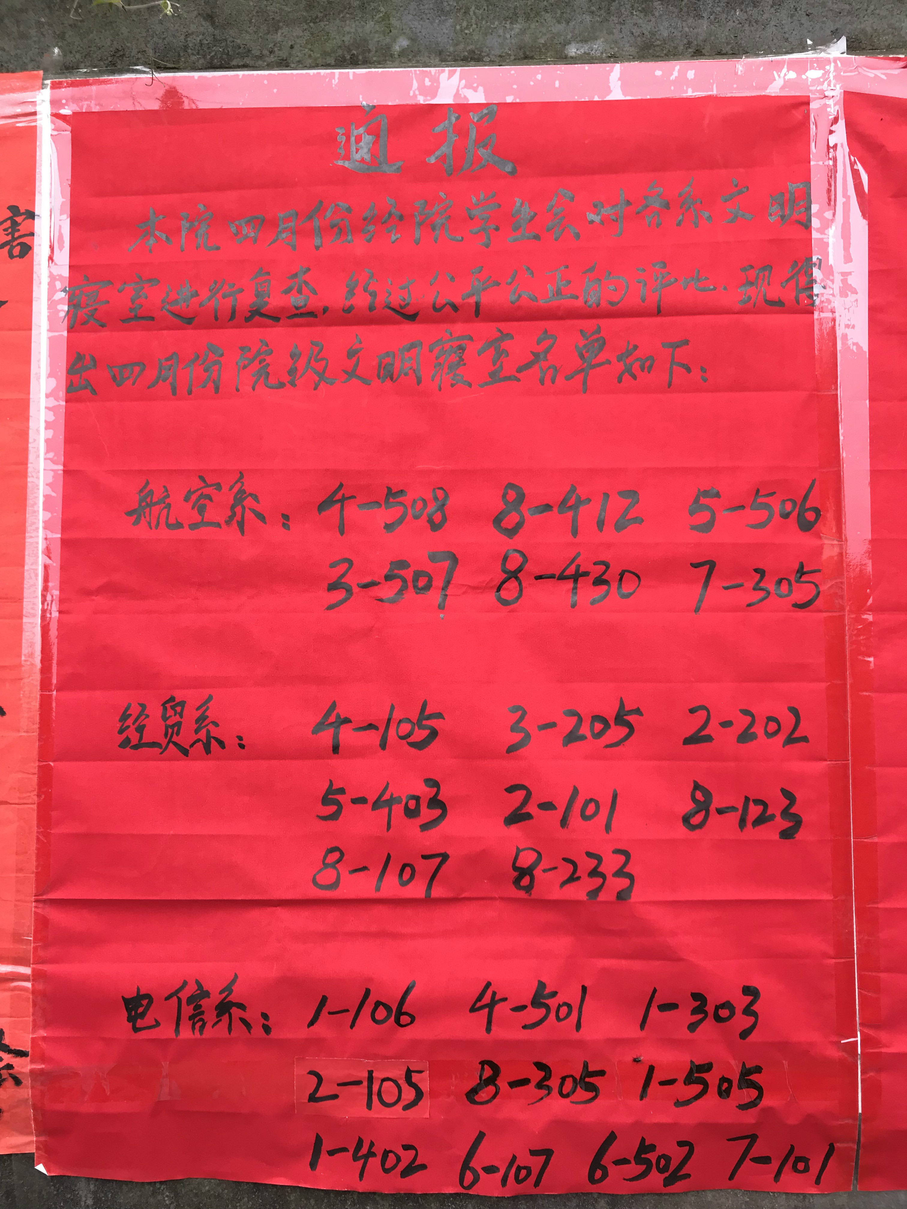 在此次文明寝室检查中航空工程系收获颇多,有六个寝室被授予“文明寝室”的荣誉称号,他们分别是4-508、8-412、5-506、3-507、8-403、7-305。以上寝室凭借细致干净的桌面,整洁的床铺,锃亮的地板,洁净的气息,整齐划一的摆设在此次评比中脱颖而出。