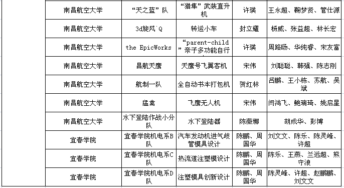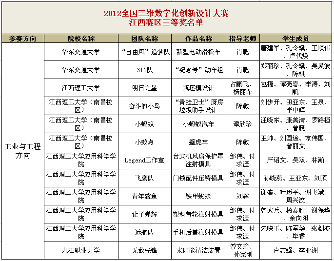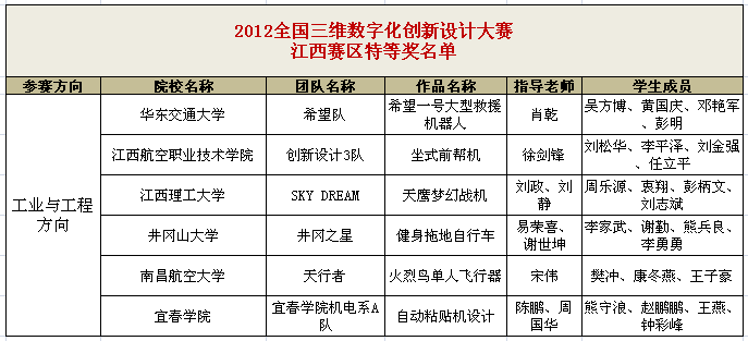 2012年 10月,第五届全国三维数字化创新设计大赛江西赛区复赛落下帷幕。此次江西赛区共有70个团队作品参加比赛,由我院航空工程系徐剑锋老师指导的5件作品参加了江西赛区复赛并全部获奖,其中特等奖一项,一等奖两项,二等奖两项。其中获得江西赛区特等奖的一组同学将于2012年11月29日代表江西赛区参加全国现场总决赛,问鼎龙鼎奖!