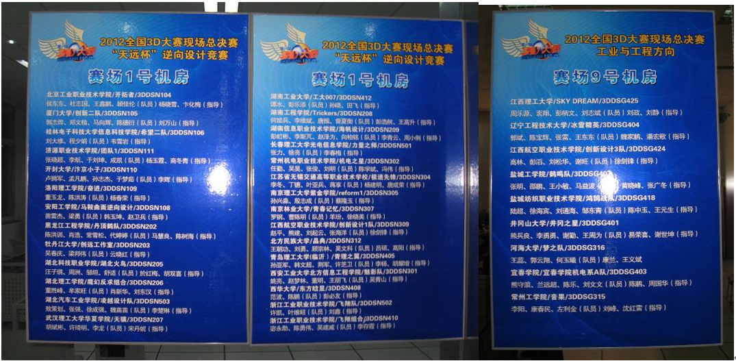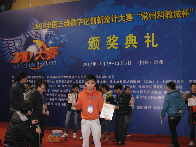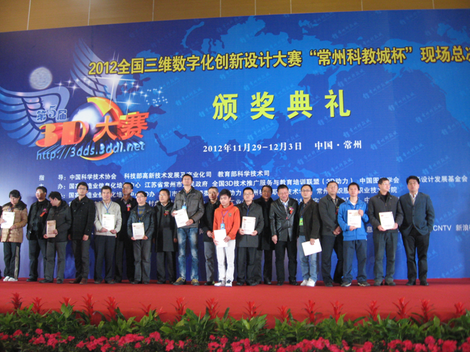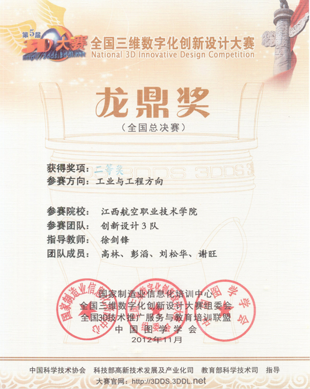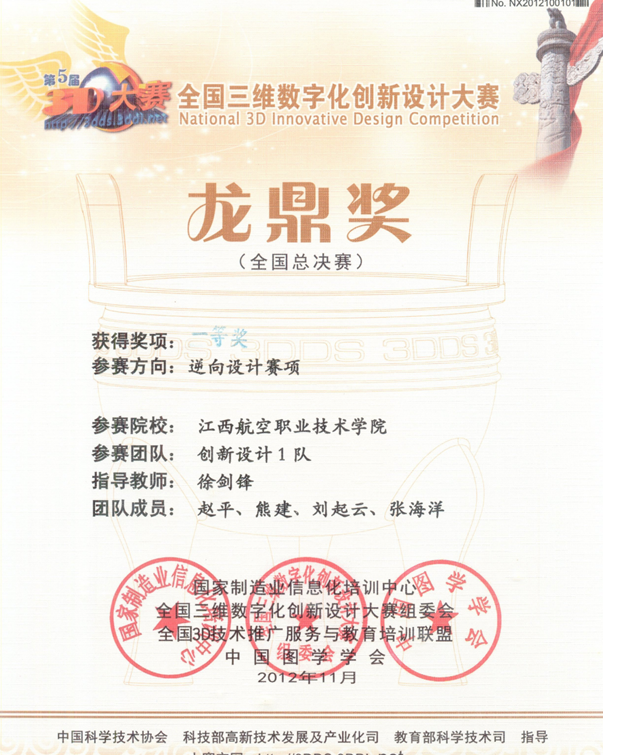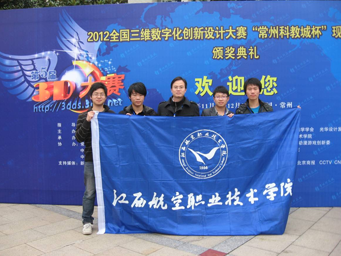 2012年12月2日,在江苏常州科教城落幕的第5届全国三维数字化创新设计大赛(3D大赛)现场总决赛中,在经历连续12个小时高强度的现场实操比拼和现场答辩后,我院航空工程系学生张海洋、赵平、熊建、刘起云组成的“创新设计1队”荣获“逆向设计”组全国总决赛一等奖的佳绩,高林、刘松华、彭滔、谢旺组成的“创新设计3队”荣获“工业工程组”全国总决赛二等奖的好成绩。江西航空职业技术学院荣获“优秀组织奖”,徐剑锋老师荣获大赛“优秀指导教师”。