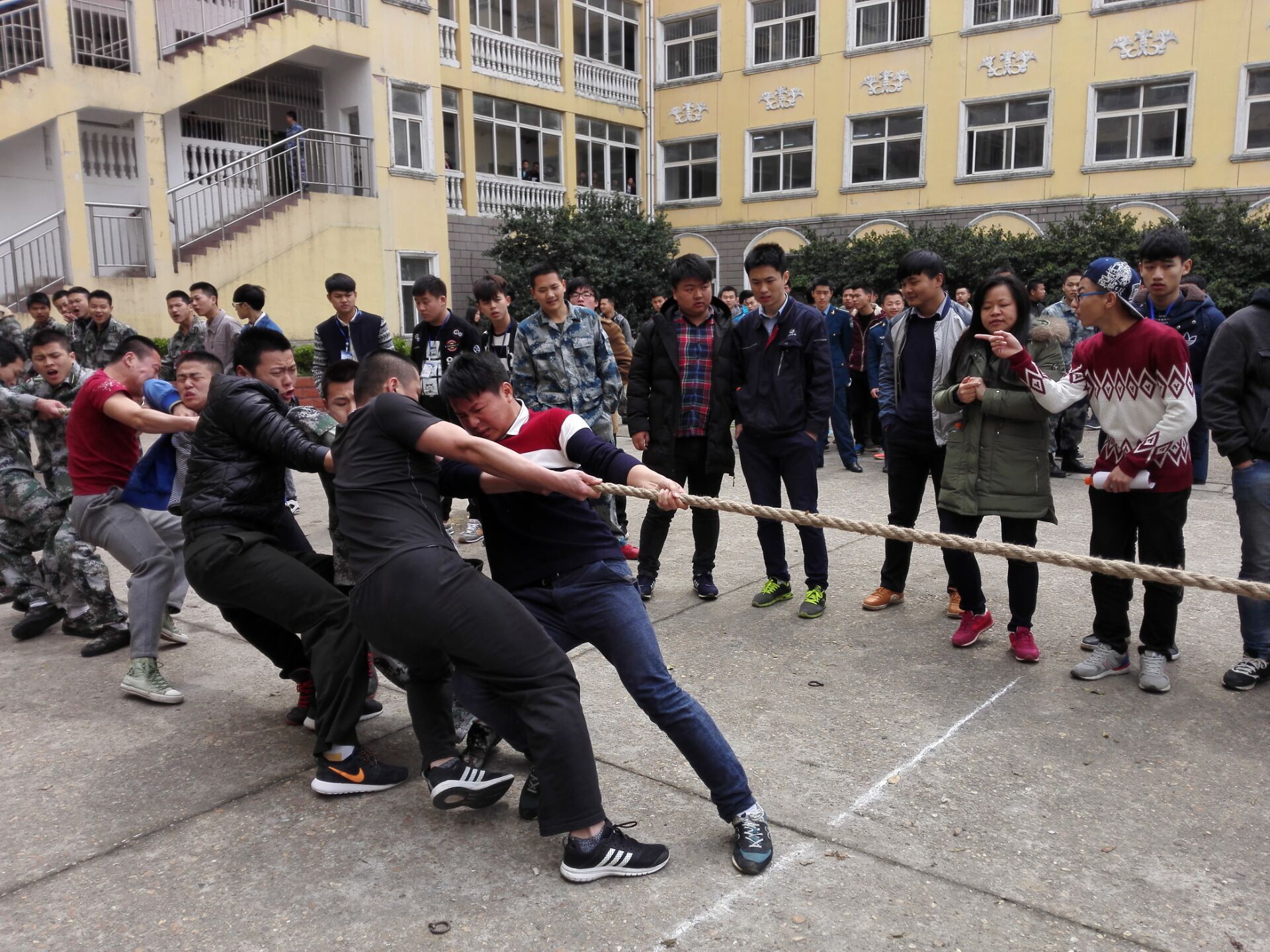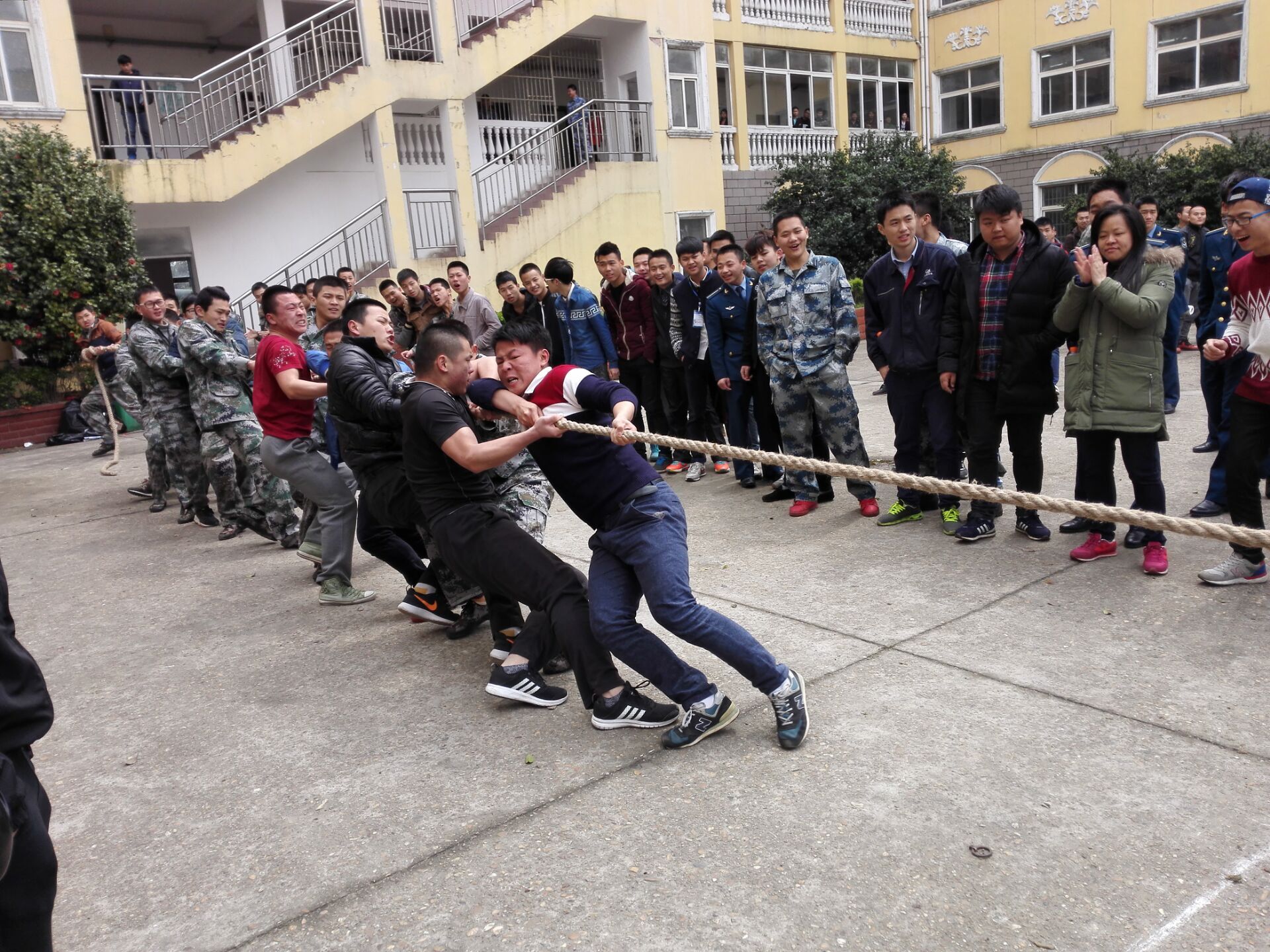 经过了前两轮拔河比赛的激烈角逐。2016年3月24日,中午12点20分。终于迎来了航空工程系拔河比赛决赛,还是在那个熟悉的地点教学楼下的露天广场。在前两轮拔河比赛中,有六组班级顺利晋级。今天,只有3个名额。哪个班级会晋级最后的名额呢?让我们拭目以待。晋级的3个班级将会推选进院里的比赛。在这激动人心的时刻,航空工程系团总支书记黄芬娜老师今天也当场观看比赛,并为我们系的同学们加油鼓劲。