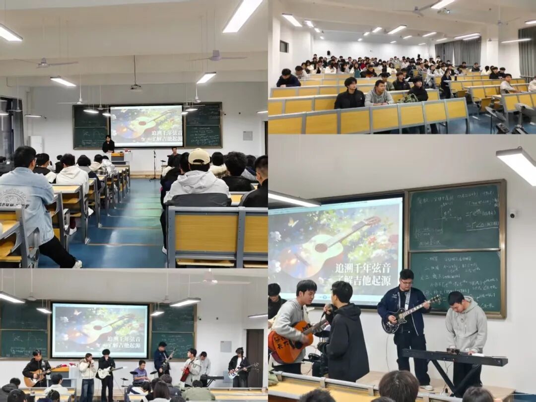 12月9日晚,吉他社团在三号公共教学楼113教室组织开展“追溯千年弦音,了解吉他起源”主题活动。本次活动中,社团负责人围绕吉他历史展开讲解,重点介绍了影响吉他形态、弦数与音色的关键历史事件;同时现场演示吉他基础音色,科普古典吉他、民谣吉他等不同种类的特点。活动最后,吉他社乐队带来精彩演出,不仅让同学们深入认识了吉他的历史起源,也增进了对乐队表演形式的了解,进一步激发了大家对吉他艺术的兴趣。