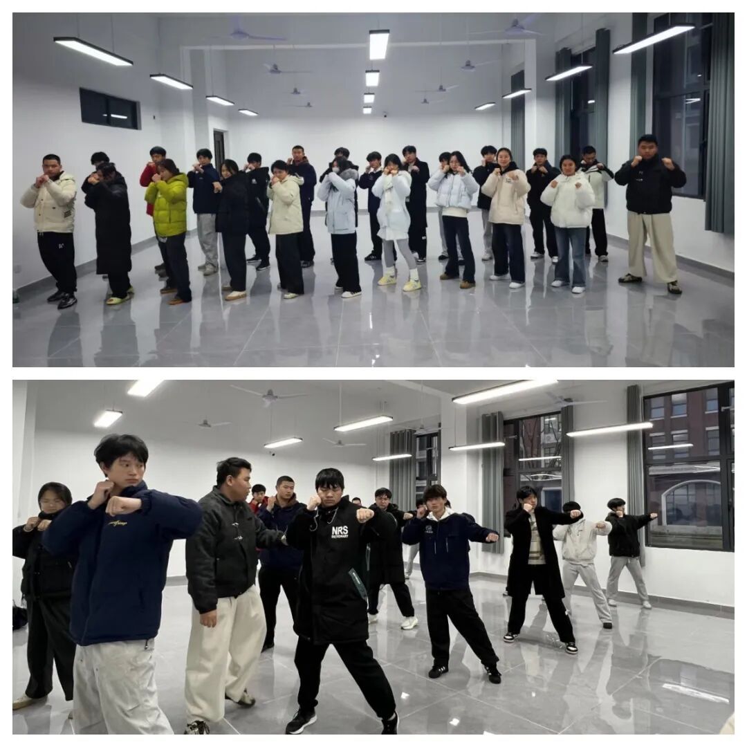 武术社团于12月24日下午,航空维修学院107教室织开展 “以武会友,精研散打” 武术散打基础教学体验活动,来自不同学院30余名同学参与其中。本次活动聚焦 “散打基础技法夯实与武道礼仪培育” 核心,引导同学们以实操为载体,围绕散打敬礼、格斗站姿、直拳、摆拳等核心内容开展学习。