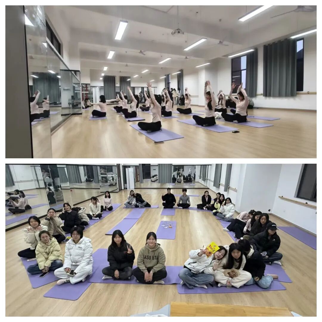 瑜伽社团在12月23日舞蹈教室开展 “身心舒展・温暖相聚” 月度集体活动。活动融合瑜伽练习、美食分享与互动交流,二十余名成员在轻松氛围中缓解学业压力、增进情感联结,收获身心放松与情感共鸣。