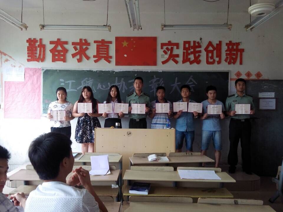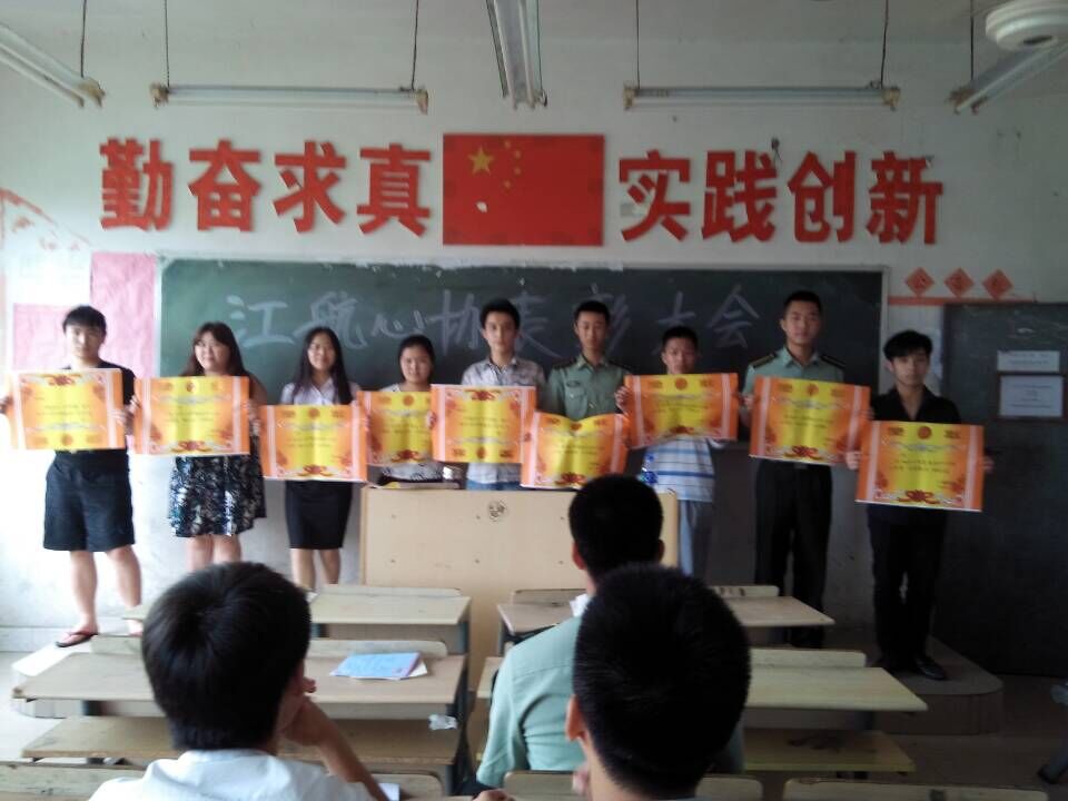 吴老师隆重宣布文化活动月里心理征文、心理黑板报和心理积极分子获奖名单。吴老师说,在这一个月里,涌现出一批杰出能干的心理积极分子,他们为协会的各项事务忙碌着、奔跑着,甚至牺牲了许多自己的课余宝贵时间。他们有的人熬夜整理主题班会文件、图片,有人起早摸黑加紧排练节目,有的人伏于案前抓耳挠腮构思着活动流程・・・・・・。另外,那投来的30多篇心理征文也静静地诉说着他们内心世界的故事,一幅幅画图精致、色彩鲜明、内容详实的黑板报把江航四十多个班级点缀得更加绚丽多彩。因此,这份荣誉是他们的,也是他们当之无愧的。我们借此表彰大会对他们辛勤的付出表示肯定和赞扬,并鼓励他们在今后的征途上再创辉煌。看着获奖同学站在讲台前高举那鲜红的荣誉证书,在场所有的人都很激动,不少同学暗下决心,我以后也要努力争取我该有的荣誉。正如居里夫人说的那样,荣誉并不重要,重要的是你对你所做的事专心投入,心无旁骛。吴老师在表达对获奖同学的祝贺之时,也勉励大家不要只看到那一张张证书,更要着眼自己每一天点滴的付出与进步。随后获奖同学与吴老师、肖老师一齐合影留念,用相册把这份喜悦永远记录在心协的史册之中。