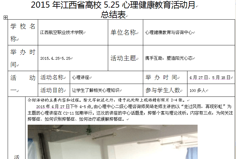 我院2015年心理健康文化月活动丰富多彩,开展了心理健康系列讲座、心理征文、心理健康黑板报评比、现场心理咨询与测试、心理团体辅导、经典心理影片欣赏、校园心理情景剧、心理素质拓展、心理健康操、心理主题班会等十大系列活动。根据心研会要求,要把所有活动事项列入相应word表格当中,根据本校心理健康教育活动月开展情况如实填写,篇幅不足者则自行复制表格加页。我院心理中心由于得到主管领导杨建辉副院长、学工处阮青处长、思政课部洪步华主任的大力支持,在中心老师吴琦、肖红、周健的通力合作下,活动开展得有声有色。吴琦老师竭尽全力认真填写报表,详实地阐述了十项活动的基本情况,尽可能地凸显我院心理活动的优势和特色。每项活动都要填写活动名称、举办时间、活动目的、参与学生人数、活动内容、活动效果等基本要素,重点是活动内容和活动效果。活动内容一栏介绍活动的主要内容和过程,除文字叙述之外,还要附上现场精彩照片2-4张。活动效果包括活动创新之处、社会反响等。