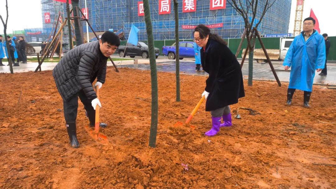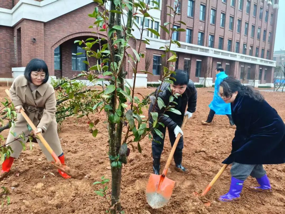 植树现场,大家干劲十足,按照规划好的种植区域,三两成组,分工明确,默契配合。放苗扶正、挥锹铲土、培土填坑、踏土夯苗、提水浇灌,成片栽下樱花树100株,红叶石楠60株,为校园更添灵动春色。植树期间,龚煌叮嘱相关部门要加强管护力度,确保栽一片、活一片、绿一片。