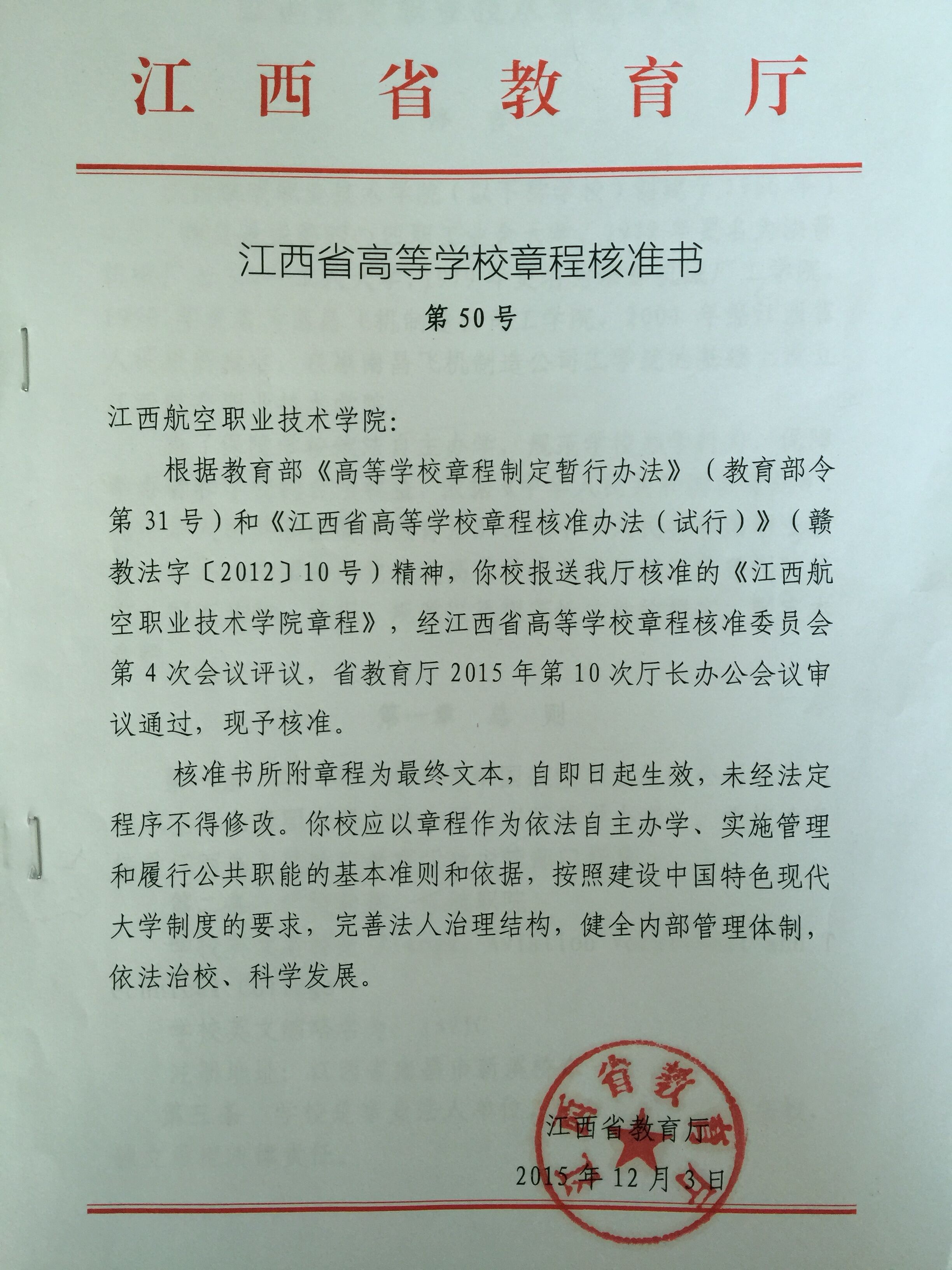 近日,江西省教育厅向江西航空职业技术学院下达《江西省高等学校章程核准书第50号(江西航空职业技术学院)》,经江西省高等学校章程核准委员会第4次会议评议,省教育厅第10次厅长办公会议审议通过,核准《江西航空职业技术学院章程》并自2015年12月3日起生效。