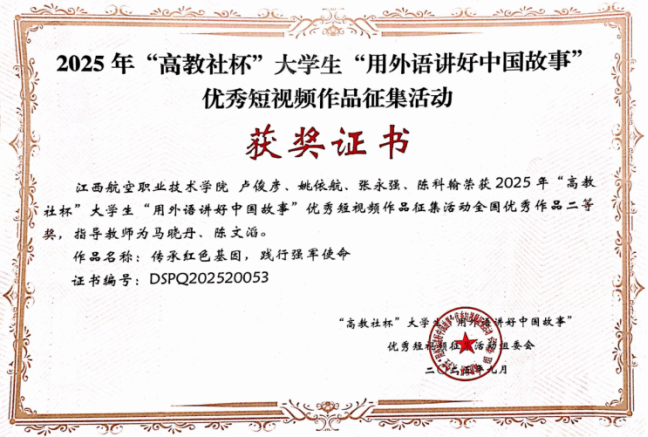 2025年9月,从“高教社杯”用英语讲中国故事全国总决赛现场传来喜讯,我校国防教育学院卢俊彦,姚依航,张永强,陈科翰四名同学凭借其出色的语言能力和深厚的文化素养,从众多优秀选手中脱颖而出,荣获全国二等奖,展现了我校学子的卓越风采。