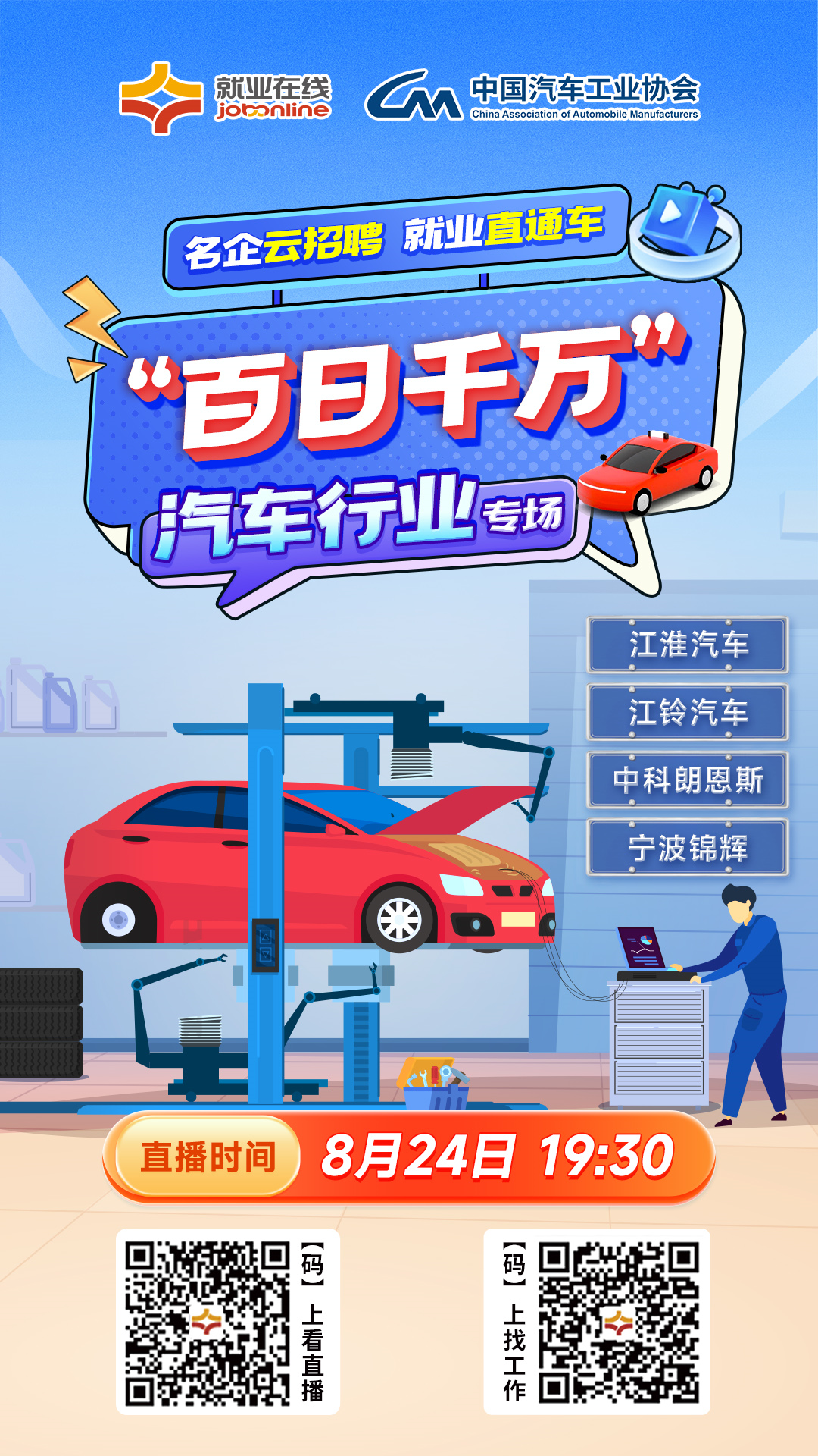 8月24日19:30,“就业在线”携手中国汽车工业协会继续开展“百日千万”——【名企云招聘 就业直通车】直播带岗活动,邀请多家知名汽车企业参与,想要云端就业,锁定就业在线汽车行业专场直播间!