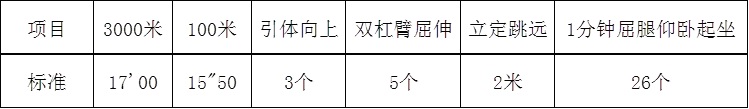 3. 男生须通过体能考核,体能考核项目及标准为: