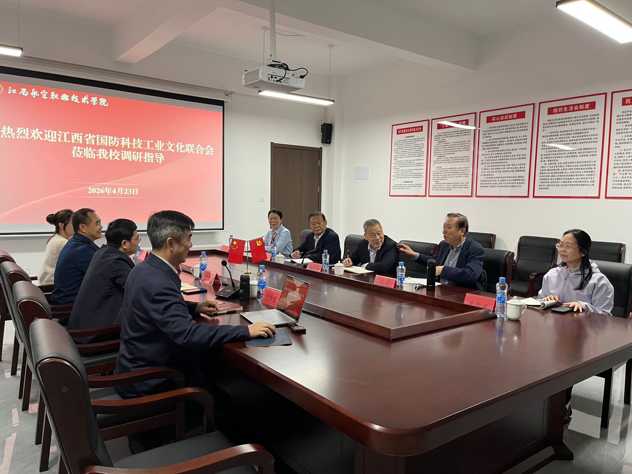 参观结束后,在行政楼 322 会议室召开座谈交流会。学校党委委员、宣传部部长仇岳猛详细介绍了学校发展概况、办学性质、专业设置、内涵建设及发展规划。他表示,学校作为首批定向培养军士试点院校、国家高技能人才培训基地,始终坚守航空报国初心,深耕特色领域,构建“南昌+抚州+南城”两校区一基地协同展格局,全力服务国防建设与地方航空产业发展,着力培养更多政治合格、专业过硬、作风优良的航空国防技能型人才。