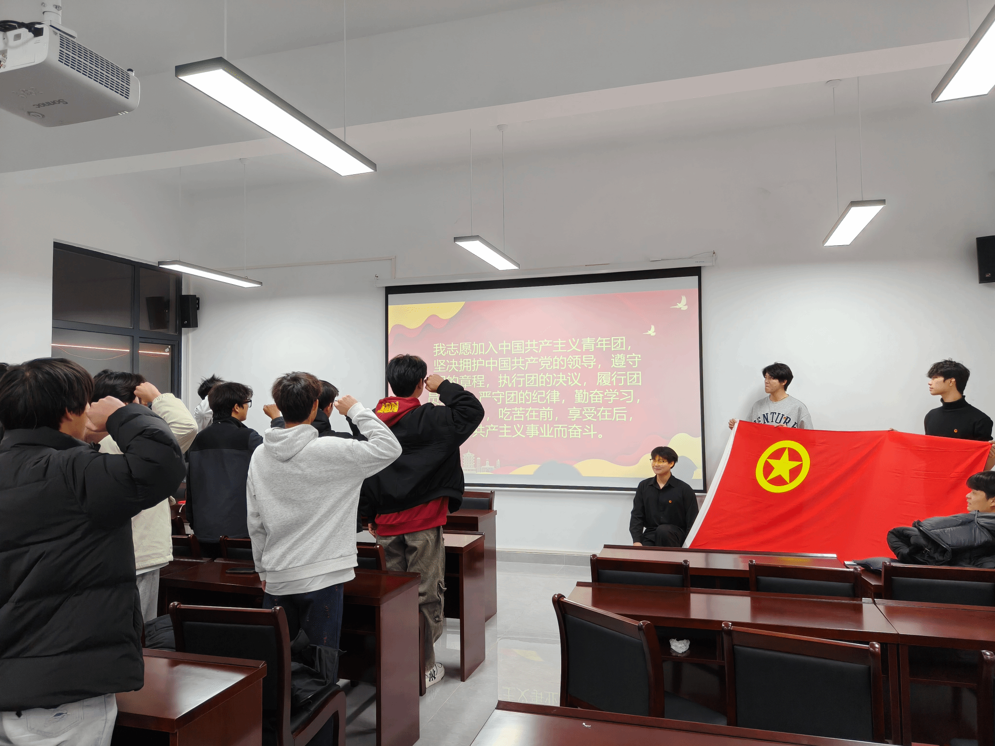 字字千钧,句句铿锵,誓言声响彻全场,久久回荡。宣誓过程中,每一位团员都眼神坚定、神情庄重,仿佛重回入团时的激动时刻。这不仅是一次简单的仪式重温,更是一次深刻的初心叩问与精神洗礼,让大家再次明确了团员的责任与使命,进一步增强了归属感、荣誉感与责任感。