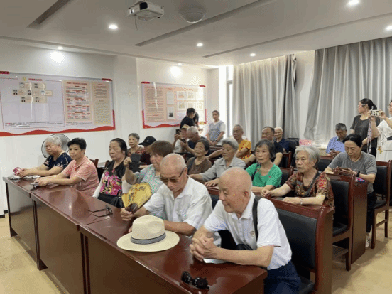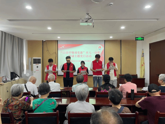 活动现场,志愿者们在社区活动室通过以诗抒情颂党恩,庆祝“七一建党日”。活动室里,鲜红的党旗悬于正中,映着台下居民们期待的目光。