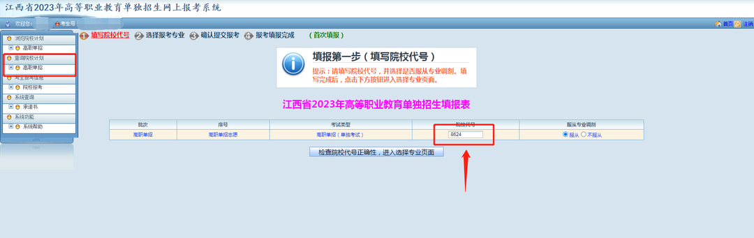 院校选择进入网上报考系统后点击“院校报考”,输入我校代码“8624”,点击服从专业调剂“服从”后,点击“进入选择专业界面”。