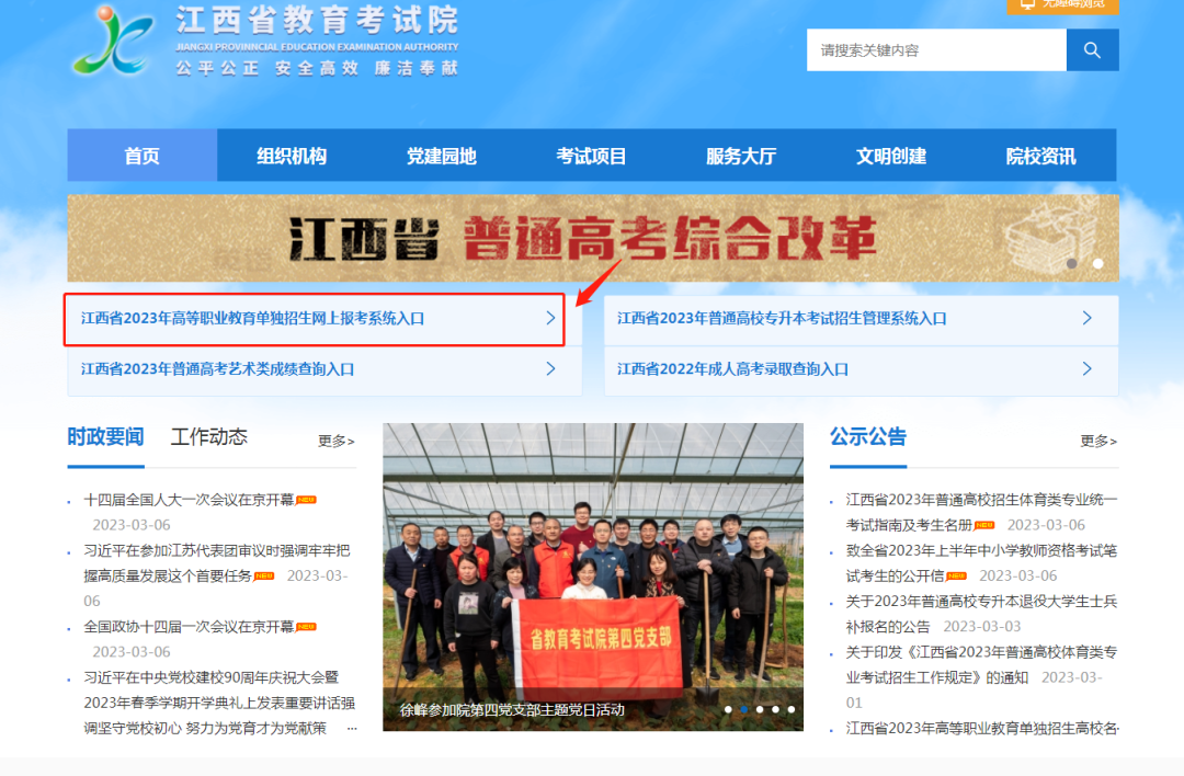 输入网址打开浏览器,输入网址进入填报系统,点击2023年江西省高等职业院校单独招生报名入口。