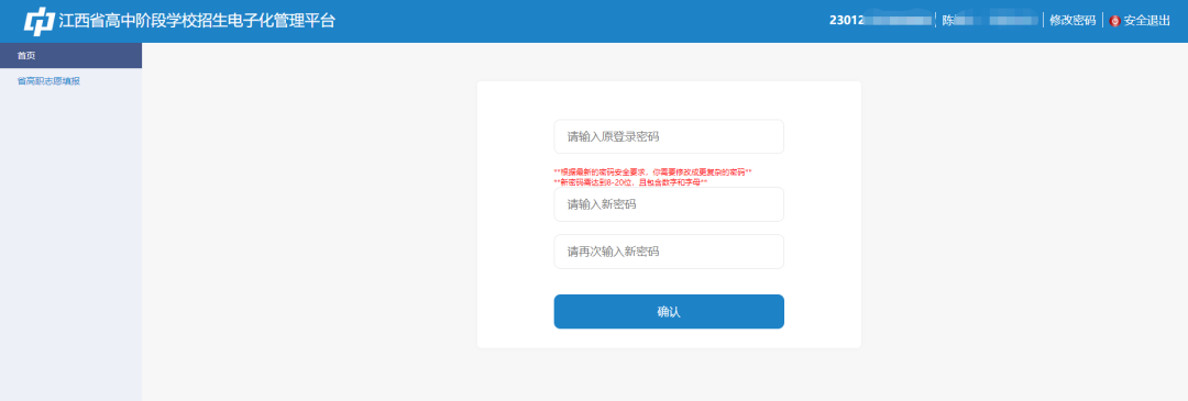 三、填报志愿方式考生用电脑登录江西省教育考试院网站(http://www.jxeea.cn),点击“初中学考”栏目,再点击左侧“志愿填报”栏目下的“非师范定向五年制高职(高专)、普通中专中高职对接”,进入“江西省高中阶段学校招生电子化管理平台”(以下简称“管理平台”)进行志愿填报。志愿填报保存之后,请退出登录,然后再次登录网站,确认是否填报成功。