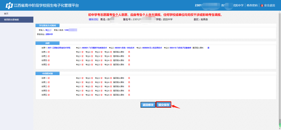 第八步:学生再次进行确认,确认完毕后点击“提交保存”。