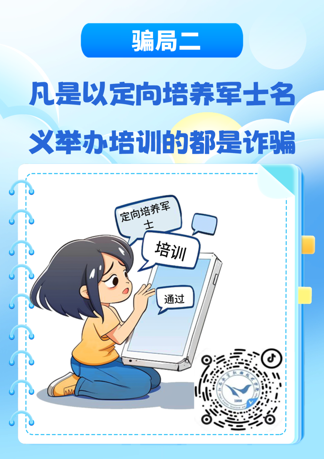 部分“培训机构”甚至某些“院校”,利用考生和家长对政策不了解,通过制作发放宣传册进行虚假招生宣传,这些宣传册封面大都与征兵宣传册很相似,封面上印有“参军”“入伍”“毕业后直接成为军士”等字样,还融入了军徽等军旅元素,报考条件甚至需要提供政治考核表等,同时还声称“有内部指标”“有资料题库”,以此为噱头索要高额学费。小伙伴们要注意!定向培养军士今年不组织面试,定向培养军士的投档录取,纳入普通高等学校招生工作,没有题库,也没有任何内部指标!