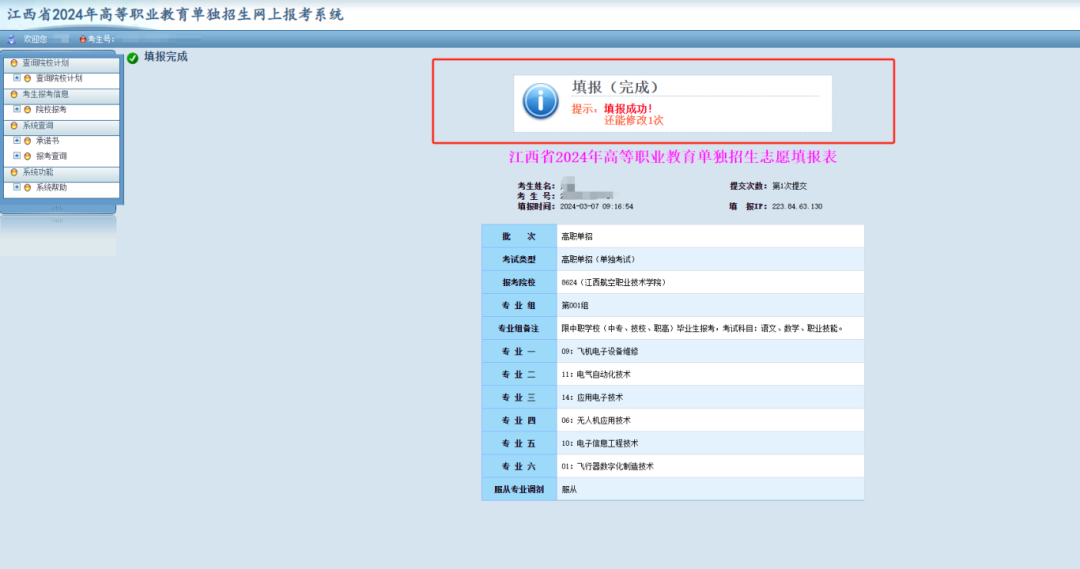 提交后,显示已完成本次单招填报。