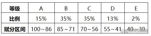 等级赋分是按统一规则,由原始成绩进行等级划定后,再由等级转换而来的分数。转换后赋分成绩满分为100分,赋分起点为30分。先将每门再选科目考生的原始成绩从高到低划分到A、B、C、D、E共5个等级,各等级人数所占比例分别约为15%、35%、35%、13%和2%。再将A至E等级内的考生原始成绩,依照等比例转换原则,分别对应转换到100~86、85~71、70~56、55~41和40~30五个分数区间,得到考生的赋分成绩。