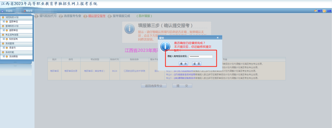 再次确认最后确认是否已经填报完成,输入高考报名密码,点击提交。