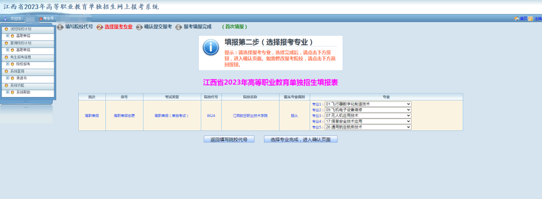 报考专业进入“选择报考专业”界面后,可根据自己意向选择5个专业。选好后进入确认页面。