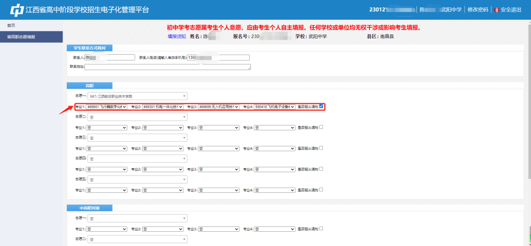 第六步:学生根据自己意愿选择专业;为有效提高录取几率,防止滑档,建议勾选同意“服从调剂”。