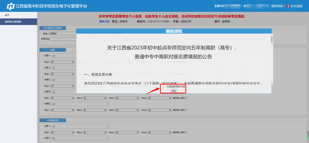 第四步:进入填报须知,阅读完毕后勾选“已阅读须知内容”并点击“确认”。