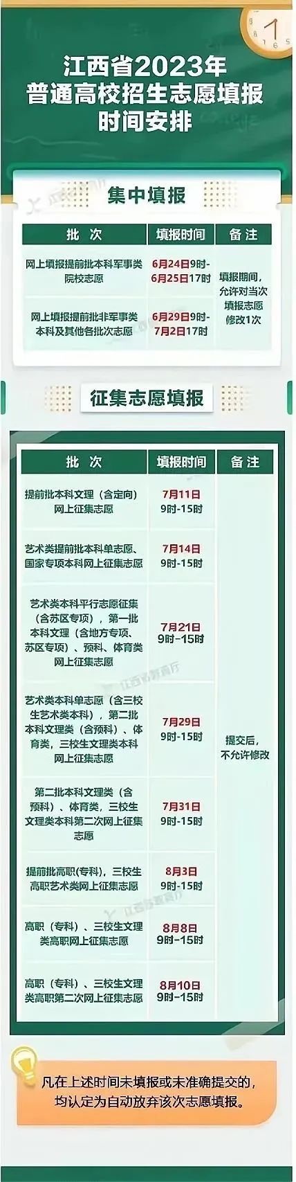6月29日9时—7月2日17时:网上集中填报江西省2023年普通高校招生提前批非军事类本科、第一批本科、第二批本科、提前批高职(专科)、高职(专科)、艺术体育类各批次、三校生本科及高职院校网上志愿。