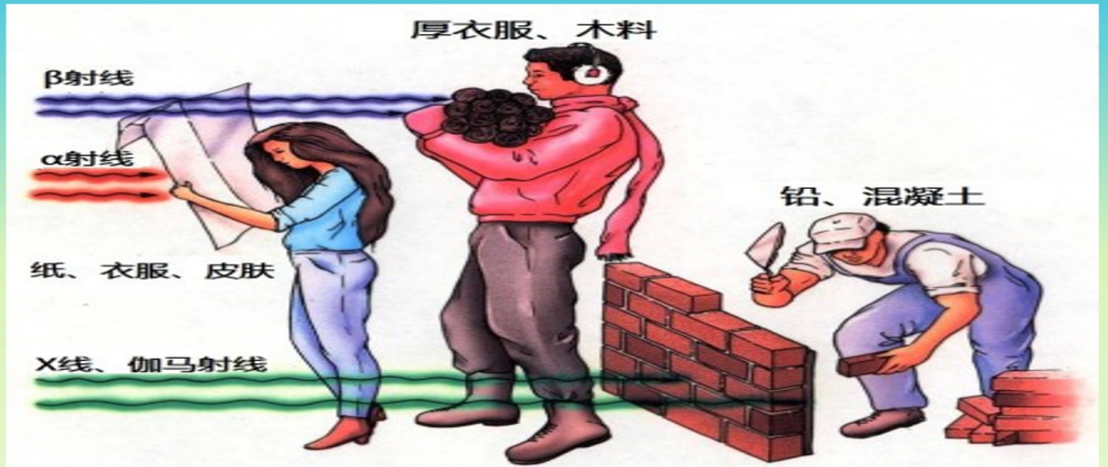 真正需要引起重视的是电离辐射,则包括α粒子、β粒子、质子、中子以及X射线、γ射线等,与人体作用将产生电离效应,破坏我们身体的组织或细胞。其中这三兄弟α、β、γ射线是电离辐射中经常遇到的三种粒子。这三兄弟的电离能力依次减弱,穿透能力依次增强,α粒子穿透能力极弱,一张白纸就可以将它们挡住。β粒子需要厚一些的木板或铝板才能让它停下脚步。γ射线,实际上就是高能光子,只有站在厚厚的混凝土墙后面才能免受它的侵袭。