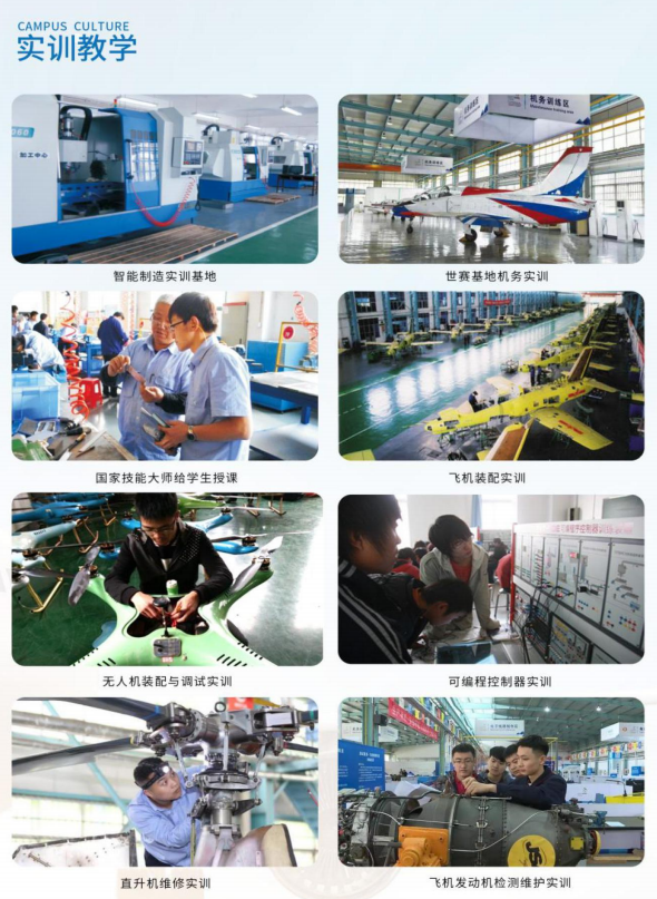 教学设施学校教学设施齐全,校内建有32个实验实训室和1个飞机制造综合实训中心,依托航空企业办学优势,建有飞机装配与调试、飞机维修与维护、航空电子设备维修、数控加工、模具制造、航空物流、计算机技术、机电技术等20个企业实训基地以及面积达5400平方米的世界技能大赛飞机维修项目“中国集训基地”,为强化学生的技能培养提供了优越条件。