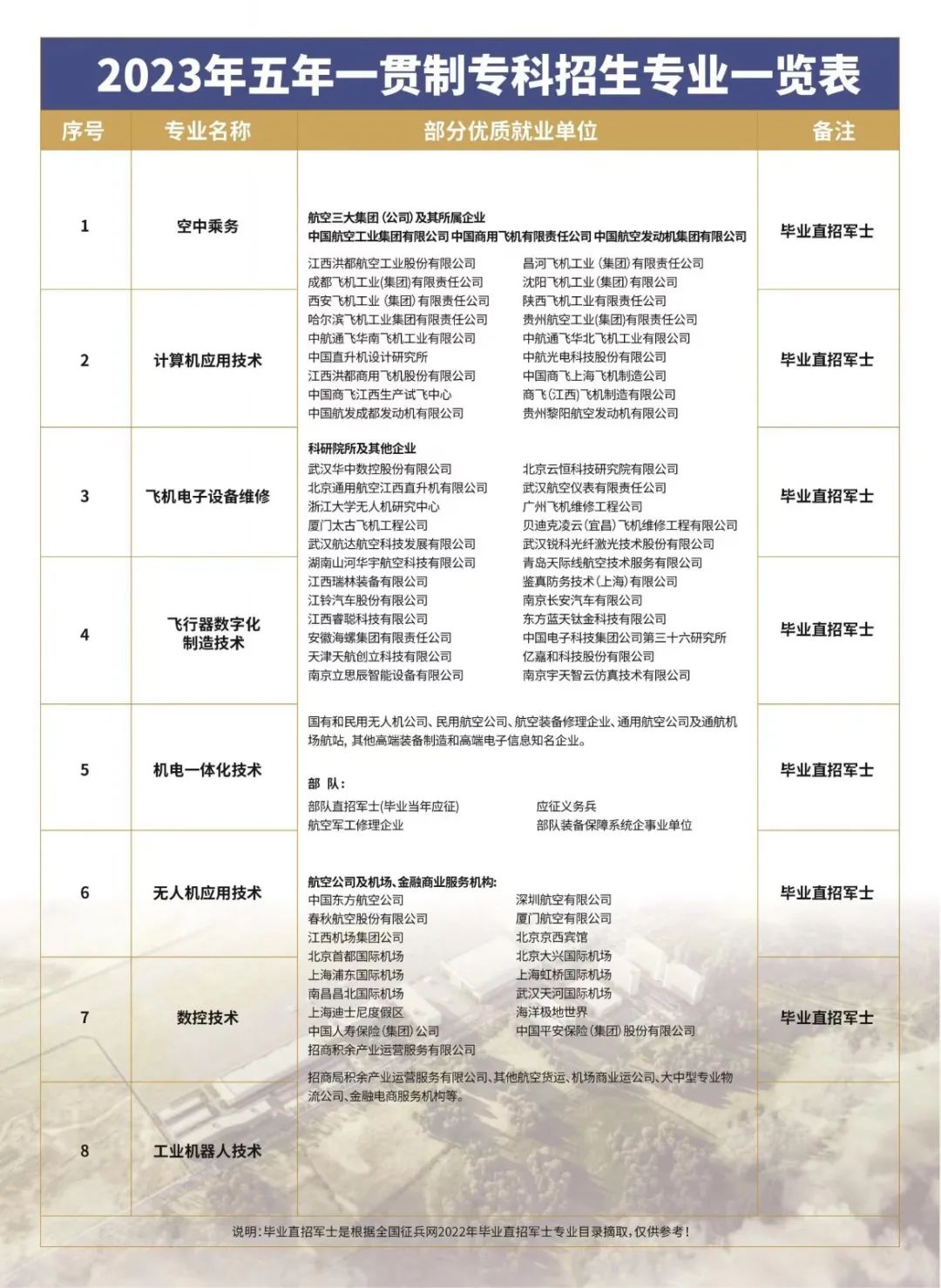 就业前景目前学校已形成了由中央航空企业、航天企业、装备制造业及航空公司等多家知名企业组成的稳定的就业基地。近五年来,毕业生就业率稳定在98%以上,每年约有70%的毕业生入职国企央企、入伍(军士、义务兵)、普通专升本升入本科,就业质量处于全省领先地位。